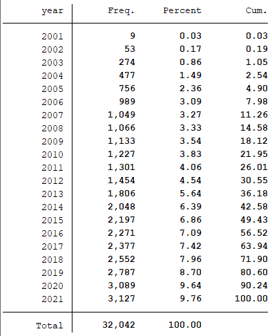 样本选择:全部A股2003-2021年数据(初始数据的起点为1998年,经过处理之后的数据起点为2003年)