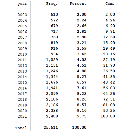 样本选择:全部A股2003-2021年数据(初始数据的起点为1998年,经过处理之后的数据起点为2003年)
