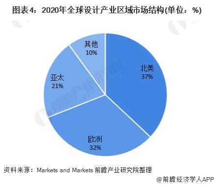 从区域分布的角度来看,北美是全球设计产业最大市场,2020年约占全球市场规模的37%;其次是欧洲,市场占比约为32%;亚太地区市场占比为21%。