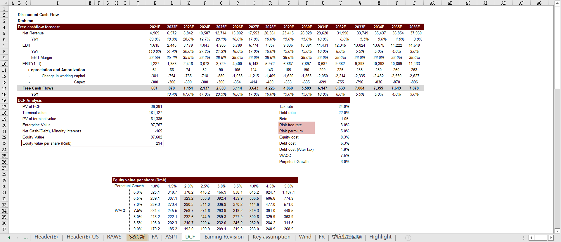 模型内容包括财务分析,收入拆分,利润表,资产负债表,现金流量表,DCF估值等几个模块。