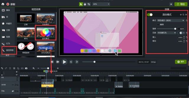 Camtasia 2022最引人注目的亮点就是新增的混合模式效果了,在“视觉效果”菜单中,Camtasia为用户添加了一个“混合模式”,支持将两种媒体的效果融合在一起,或者通过自定义外观来创建电影效果到屏幕内容。