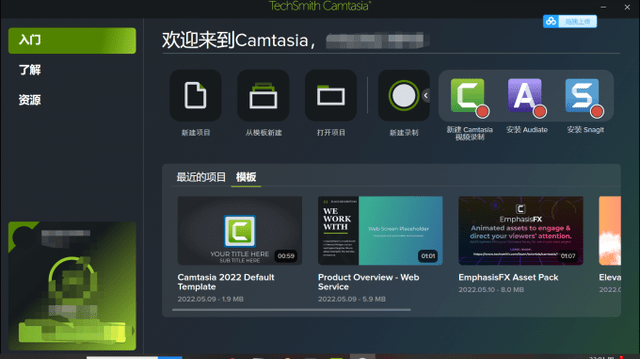 我们一打开软件,就可以看到Camtasia 2022主界面的变化,Camtasia 2022将创建工具、模板、项目、产品支持等功能放在了主界面中,用户可以快速选择要使用的功能,简化用户的操作流程,提高用户创建项目和编辑的效率。