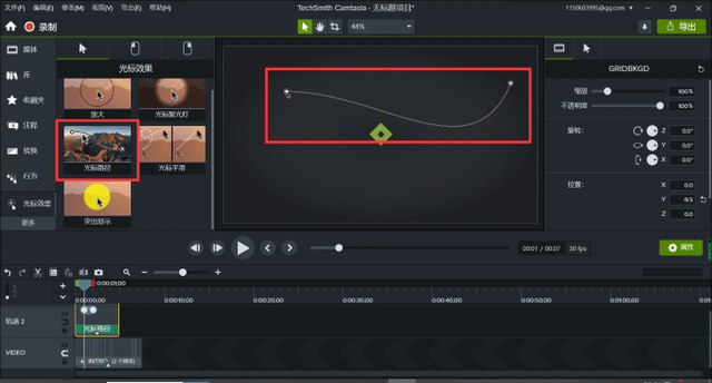 另外,Camtasia 2022还新增了一种光标效果——光标路径,屏幕录制过程中,鼠标光标的位置和路径至关重要,使用“光标路径”功能,会在视频中添加一条曲线,拖动曲线上的点即可完成光标路径的设置。