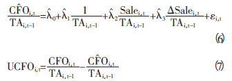 我们利用模型(5)回归后得到的各变量系数,采用模型(6)和模型(7)分别计算公司经资产总额(滞后一期) 调整后的正常经营活动现金流和非正常经营活动现金流: