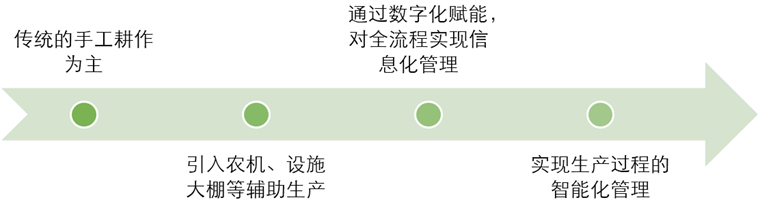 数字农业是对农业传统生产、管理和销售模式的一次升级,即通过数字化赋能农业和农民,对农业种养殖过程中的育种、灌溉、施肥、饲养、疾病防治、运输和销售等环节进行信息化管理,最终实现农业生产效率和产品价值的提升。回顾中国农业的发展,大体可以分为四个阶段:第一阶段,即以传统手工耕作为主的生产经营方式;第二阶段,即引入农机、设施大棚等现代工具辅助农业生产经营;第三阶段,即当下农业发展的趋势之一,通过数字化赋能农业,实现对农业全流程的信息化管理;第四阶段,即农业未来的发展目标,通过人工智能技术,实现农业生产过程的智能化管理。