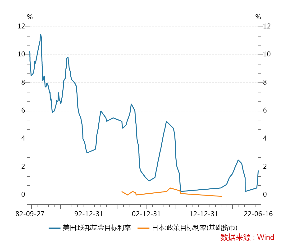 图2:美国和日本基准利率变化趋势