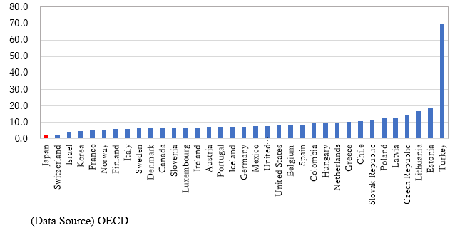 以上文提到的美元/日元为例,2022年上半年在高通胀威胁下,美联储大幅加息,而日本经济存在较大产出缺口(图3),尚未恢复至疫情前水平,复苏力度慢于欧美国家,日本通胀水平在OECD国家中最低(图4),日本央行加息的紧迫性较低,因此,依然维持宽松货币政策,导致做空日元成为市场上最多的交易之一,日元也贬至1998年10月以来低点。