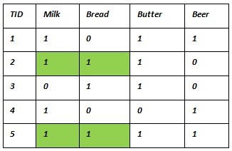 在下表中,Support (milk->bread) = 0.4 表示牛奶和面包一起购买,占所有交易的 40%。置信度(牛奶->面包)= 0.5 意味着如果有 100 笔交易包含牛奶,那么将有 50 笔交易也包含面包。