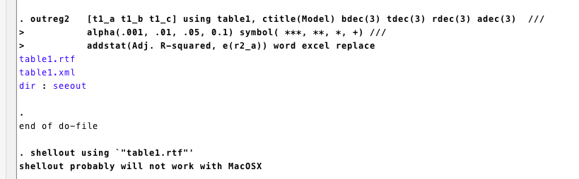 我已经安装了outreg的安装包,做了几个回归,但是回归的结果出不来,该怎么办呢?上面显示的应该是不支持mac系统。