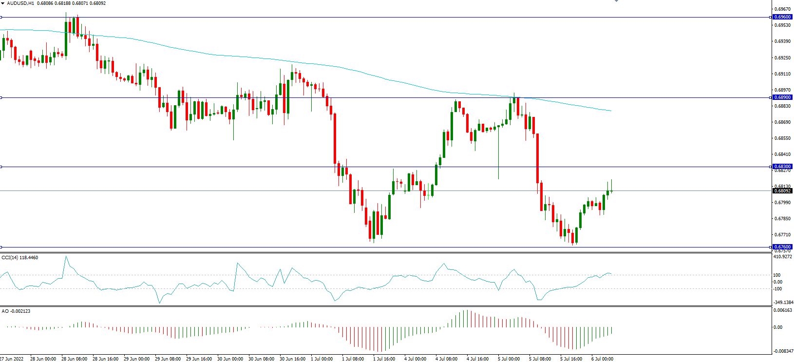 由澳币对美元的小时图来看,200MA趋势持续向下,由于澳币受到铁矿砂价格影响甚巨,在铁矿砂本季目标价下修且美元持续强劲的背景下,澳币对美元长线走势并不看好,短期操作可采取低买高卖的交易策略。昨日(7/5)价格碰触到200MA后便持续下跌,跌至7/1低点0.676后有所支撑并出现止跌回稳,可参考CCI突破100以及AO柱线突破0线作为进场时机,这波上涨趋势恐于0.683价位遇到压力,若能进一步突破此价位,将带来更多上涨动能,下一个压力位置将在200MA的0.689价位,若能突破此价格,未来才有机会突破0.7的关键价位。