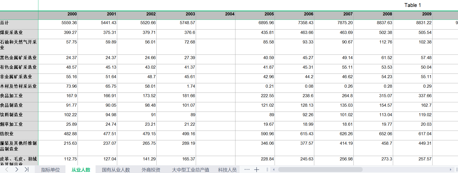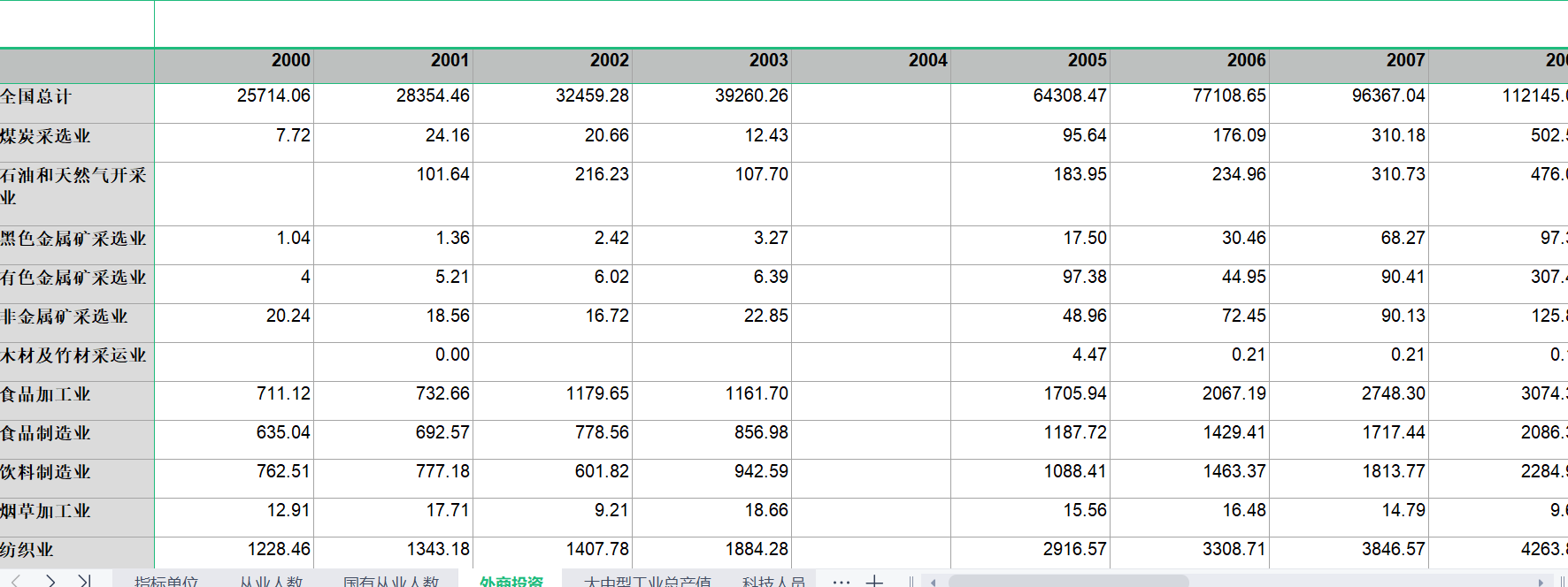 从业人数万人国有从业人数万人外商投资亿元大中型工业总产值亿元科技人员人科技机构个R&D内部支出万元规模以上工业企业单位数个行业实收资本亿元工业废水处理状况万元工业废气处理状况万元