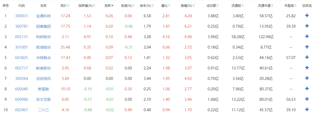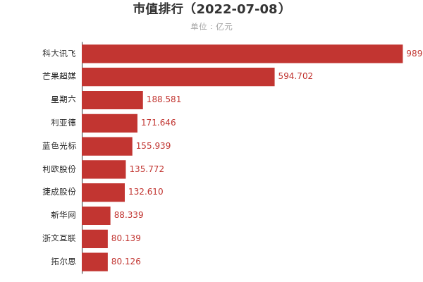 流通市值排名TOP5上市公司:科大讯飞、芒果超媒、星期六、利亚德、蓝色光标