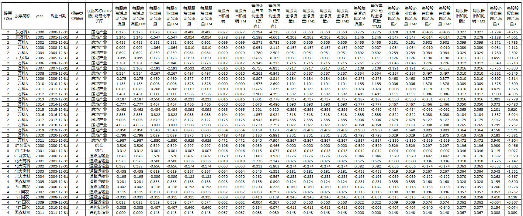 每股筹资活动现金净流量 每股筹资活动现金净流量TTM 每股企业自由现金流量 每股企业自由现金流量TTM 每股股东自由现金流量 每股股东自由现金流量TTM 每股折旧和摊销 每股折旧和摊销TTM 每股企业自由现金流(原有) 每股股权自由现金流(原有) 每股现金净流量1 每股现金净流量TTM1 每股现金净流量2 每股现金净流量TTM2 每股筹资活动现金净流量2 每股筹资活动现金净流量TTM2 每股企业自由现金流量2 每股企业自由现金流量TTM2 每股股东自由现金流量2 每股股东自由现金流量TTM2 每股折旧和摊销2 每股折旧和摊销TTM2 每股企业自由现金流量3 每股股权自由现金流量3