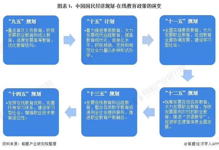 在线教育的包含范围广泛,目前主要有低幼及素质教育、K12教育、职业教育及成人语言等类型。从我国“九五”规划开始,国家关注职业教育和成人教育;“十五”规划,首次提出大力发展现代远程教育,提高教育现代化;“十一五”规划,明确全面实施素质教育;“十二五”到“十四五”规划,重点放在发挥在线教育优势,大力发展职业教育,促进教育资源公平。