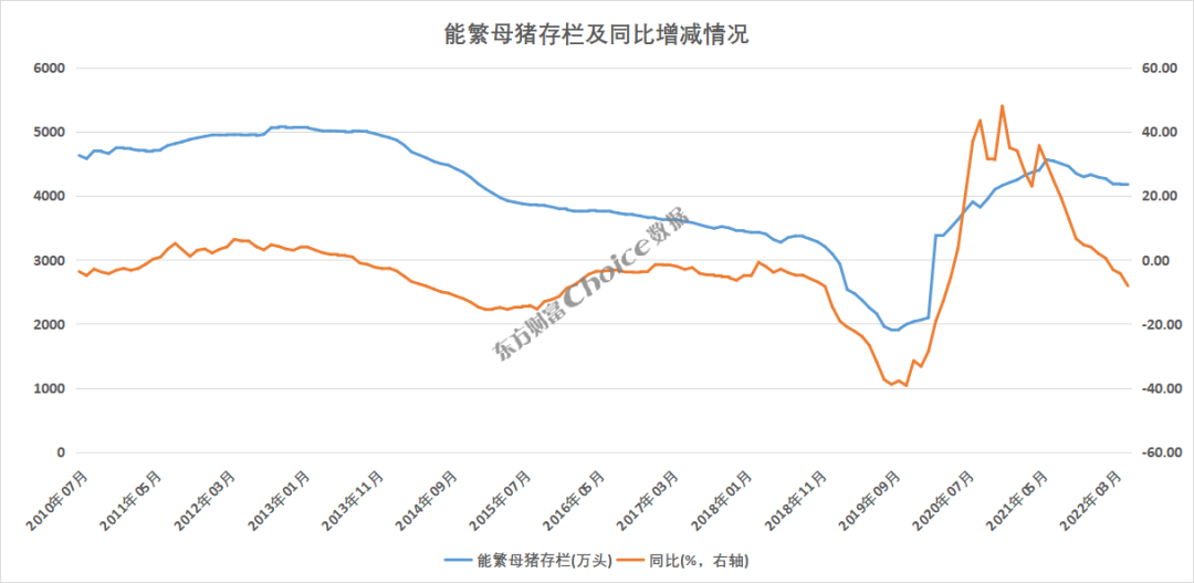 Choice数据显示,当前生猪存栏量和能繁母猪存栏仍处于较高位置,截至5月,生猪存栏约4.3亿头,但存栏量增速自今年1月降至个位数后,4月、5月已连续两个月为负。