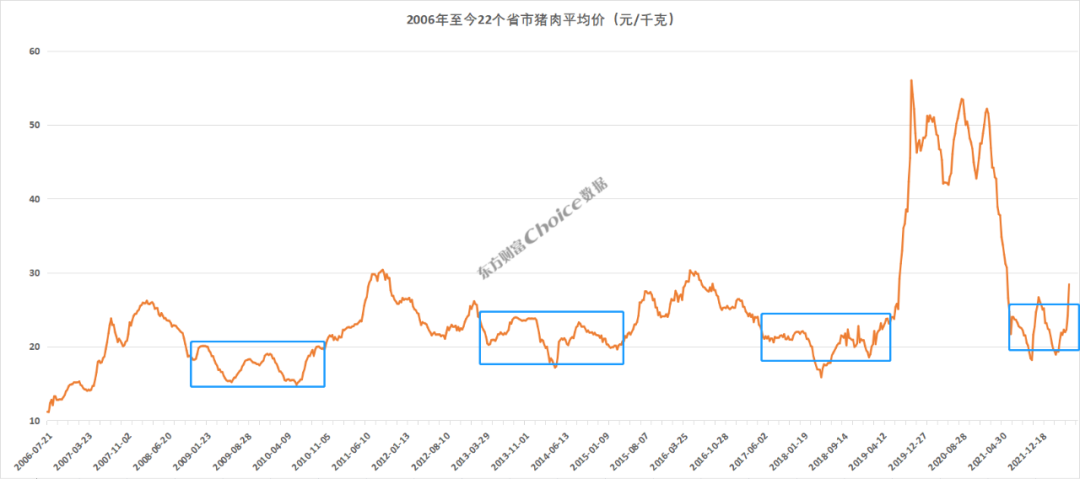 Choice数据显示,自2006年至今,猪肉价格经历了4轮完整的“猪周期”,每一轮周期的时间四年左右。