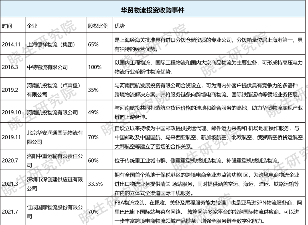 2019年,华贸物流收购华安润通以切入跨境电商邮政包裹市场,并获取相关航空资源;2021年3月,收购深创建供应链,使得业务延伸至中港运输以及关务申报,补足前端揽件能力,获得跨境电商监管功能区资源;2021年7月,收购佳成国际,实现已有关务和干线能力与佳成国际的供应链体系协同,进一步丰富跨境电商物流领域产品链条。