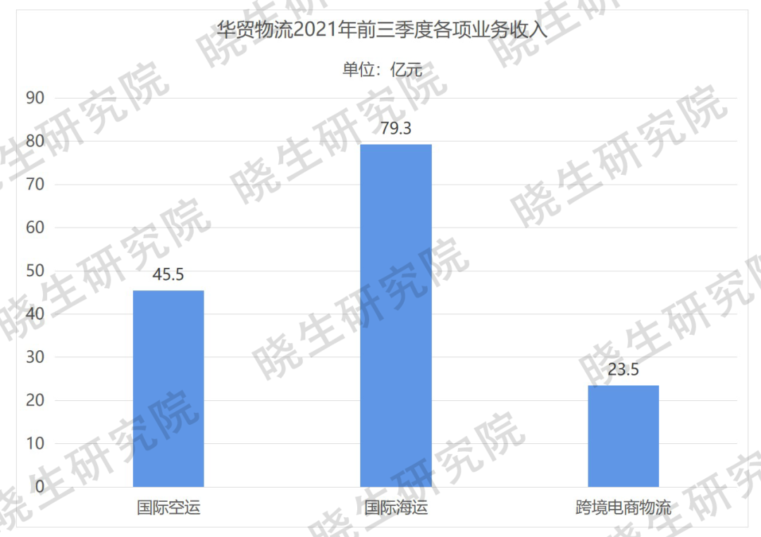 2021年前三季度,华贸物流的营收达到166.02亿元,同比增长69.2%,净利润6.7亿元,同比增长65.92%。其中,国际空运营收45.5亿元,同比增长6.3%,国际海运营收79.3亿元,同比增长151.8%;跨境电商物流营收23.5亿元,同比增长99.8%。
