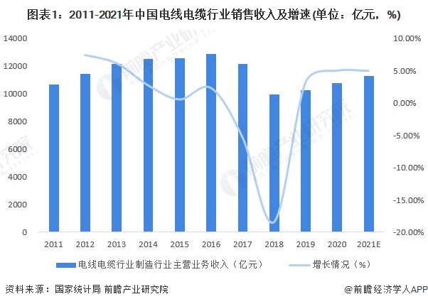 根据国家统计局公布的数据,近年来我国电线电缆行业规模扩张有所放缓,2015-2020年我国电线电缆销售收入总体呈波动变化的趋势。由于近年来我国宏观经济疲软和制造业去产能的影响,电线电缆行业一度出现规模下滑,并在2018年达到低谷,达到0.99万亿元。随着我国对新能源等投资的加快,电线电缆行业开始缓慢复苏。2020年电线电缆销售收入达1.08万亿元,同比增长5.02%。预计2021年我国电线电缆销售收入将超过1.1万亿元。