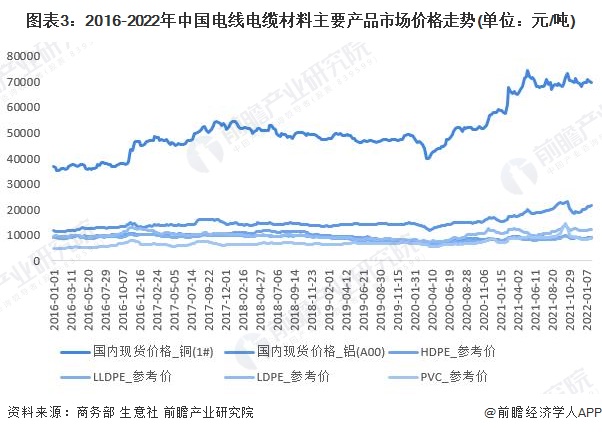 从价格走势来看,近年来我国电线电缆材料主要产品市场价格整体呈现稳定波动的态势。2021年铜、铝等原材料价格开始大幅上涨,对下游电线电缆行业业绩造成压力。