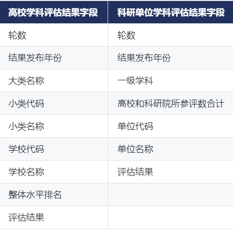 CnOpenData数据团队推出中国学科评估数据,分为两张子表:高校学科评估结果、科研单位学科评估结果。同时,为加强不同学科门类的分类评估,体现其门类特色,指标体系又具体分为“人文社科”、“理学”、“工学”、“农学”、“医学”、“管理学”、“艺术学”等七类