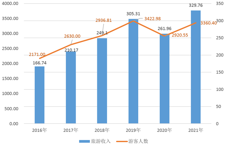 图1 2016-2021年巴中市旅游产业主要指标变化情况(单位:亿元;万人)