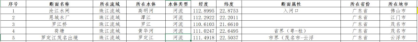 “十四五”广东省地表水水质国控断面坐标位置数据,共167个断面坐标,可配合全国地表水水质月报或个人研究使用。数据含断面名称、所在流域、所在水体、水体类型、经度、纬度、断面属性、所在省份、所在地市)。