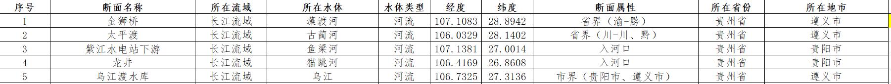 “十四五”贵州省地表水水质国控断面坐标位置数据,共110个断面坐标,可配合全国地表水水质月报或个人研究使用。数据含断面名称、所在流域、所在水体、水体类型、经度、纬度、断面属性、所在省份、所在地市)。