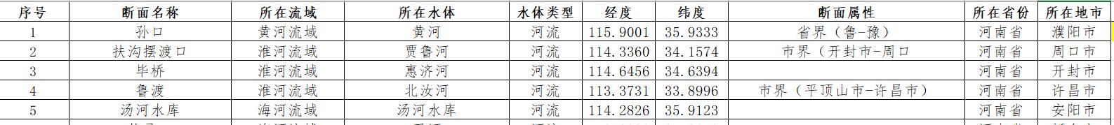 “十四五”河南省地表水水质国控断面坐标位置数据,共154个断面坐标,可配合全国地表水水质月报或个人研究使用。数据含断面名称、所在流域、所在水体、水体类型、经度、纬度、断面属性、所在省份、所在地市)。