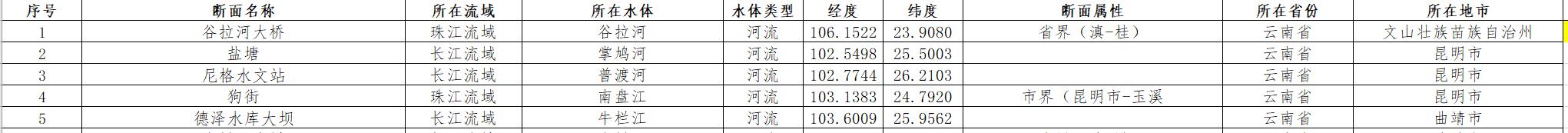 “十四五”云南省地表水水质国控断面坐标位置数据,共184个断面坐标,可配合全国地表水水质月报或个人研究使用。数据含断面名称、所在流域、所在水体、水体类型、经度、纬度、断面属性、所在省份、所在地市)。