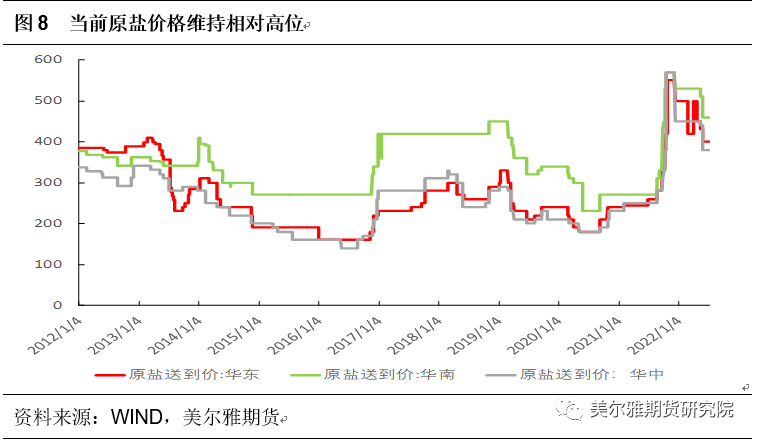 但从2021年下半年开始,部分省份发布能耗“双控”措施,国内烧碱企业出现降负生产甚至停车现象,产量明显下降;加上下游氧化铝行业消化烧碱能力增加,使市场货源供应紧张。此外,随着电价和原盐价格上调,烧碱和纯碱生产成本明显增加,这也是支撑2021年下半年纯碱、烧碱市场价格同时上涨原因。(专业的工具让交易事半功倍,宗迹期货数据:机构主力数据,一键可查)