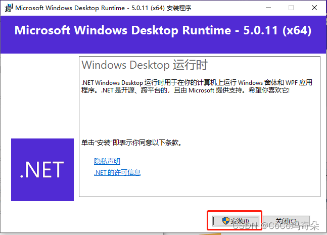 3.双击下载好的windowsdesktop runtime程序进行安装。点击【安装】。