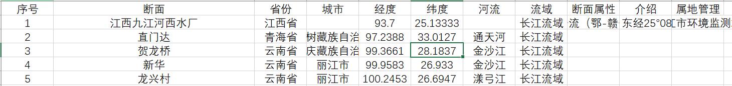 长江流域地表水水质自动监测站坐标位置数据,含断面名称、所在省份、所在城市、经度、纬度、所在河流、所在流域、断面属性、介绍、属地管理,共591条,可分流域和省市),配合国家地表水水质自动监测实时数据发布系统(https://106.37.208.243:8068/GJZ/Business/Publish/Main.html)或个人研究使用。