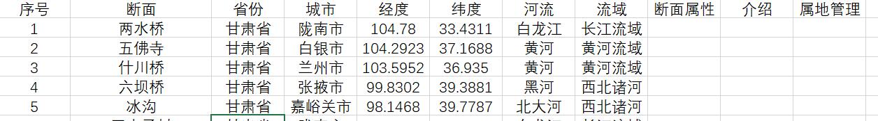 甘肃省地表水水质自动监测站坐标位置数据,含断面名称、所在省份、所在城市、经度、纬度、所在河流、所在流域、断面属性、介绍、属地管理,共29条,可分流域和省市),配合国家地表水水质自动监测实时数据发布系统(https://106.37.208.243:8068/GJZ/Business/Publish/Main.html)或个人研究使用。