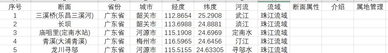 广东省地表水水质自动监测站坐标位置数据,含断面名称、所在省份、所在城市、经度、纬度、所在河流、所在流域、断面属性、介绍、属地管理,共102条,可分流域和省市),配合国家地表水水质自动监测实时数据发布系统(https://106.37.208.243:8068/GJZ/Business/Publish/Main.html)或个人研究使用。