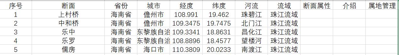海南省地表水水质自动监测站坐标位置数据,含断面名称、所在省份、所在城市、经度、纬度、所在河流、所在流域、断面属性、介绍、属地管理,共37条,可分流域和省市),配合国家地表水水质自动监测实时数据发布系统(https://106.37.208.243:8068/GJZ/Business/Publish/Main.html)或个人研究使用。