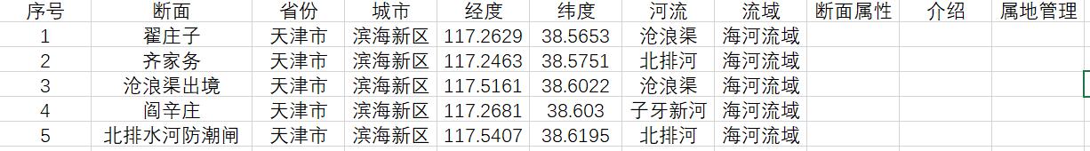 天津市地表水水质自动监测站坐标位置数据,含断面名称、所在省份、所在城市、经度、纬度、所在河流、所在流域、断面属性、介绍、属地管理,共31条,可分流域和省市),配合国家地表水水质自动监测实时数据发布系统(https://106.37.208.243:8068/GJZ/Business/Publish/Main.html)或个人研究使用。