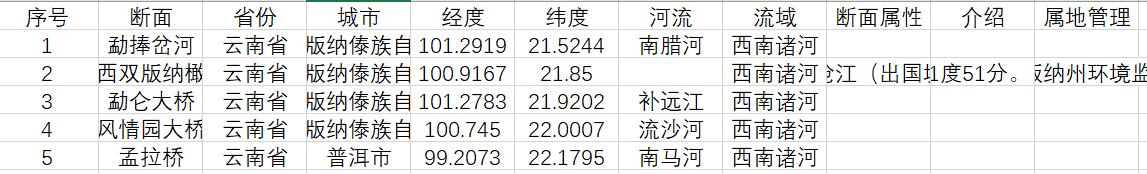 云南省地表水水质自动监测站坐标位置数据,含断面名称、所在省份、所在城市、经度、纬度、所在河流、所在流域、断面属性、介绍、属地管理,共105条,可分流域和省市),配合国家地表水水质自动监测实时数据发布系统(https://106.37.208.243:8068/GJZ/Business/Publish/Main.html)或个人研究使用。