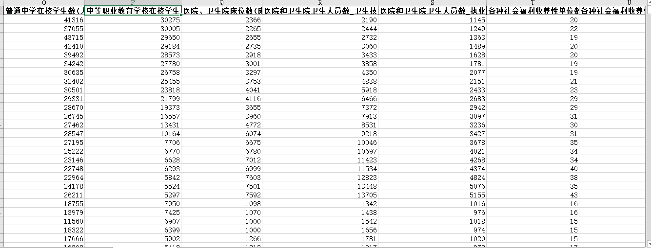 5、数据指标包括行政区域土地面积(平方公里)、普通小学学校数(个)、普通中学学校数(个)、普通小学专任教师数(人)、普通中学专任教师数(人)、普通小学在校生数(人)、普通中学在校学生数(人)、中等职业教育学校在校学生数(人)、医院、卫生院床位数(床)、医院和卫生院卫生人员数_卫生技术人员(人)、医院和卫生院卫生人员数_执业医师(人)、各种社会福利收养性单位数(个)、各种社会福利收养性单位床位数(床)。