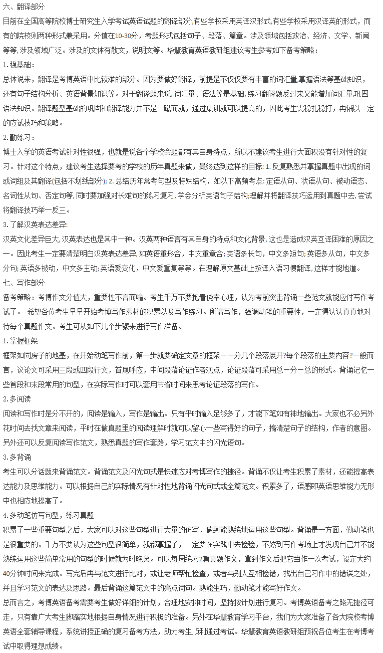 目前,我国博士研究生英语入学考试采取的是各招生院校自行命题、自行组织考试的办法。各个院校的题型、考查点都有相当大的差异,且基本上不指定参考书目,考生在备考时往往感觉不知如何进行针对性地复习。有些考生问难道没有备考策略可以参照学习吗?针对考生的备考疑惑,华 慧教育英语教研组根据多年的经验写了这篇考博英语最新备考策略供广大考生参考。