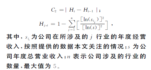 1.7收入熵EI=Σpi×ln(1/pi) ,pi为行业收入占总收入的比重,EI 数值越大,公司多元化程度越高。