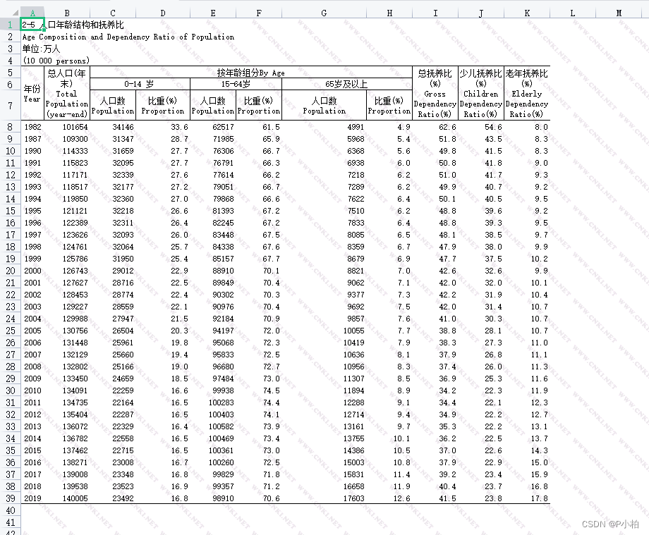 全国人口年龄结构和抚养比1982-2021总抚养比少儿抚养比老年抚养比