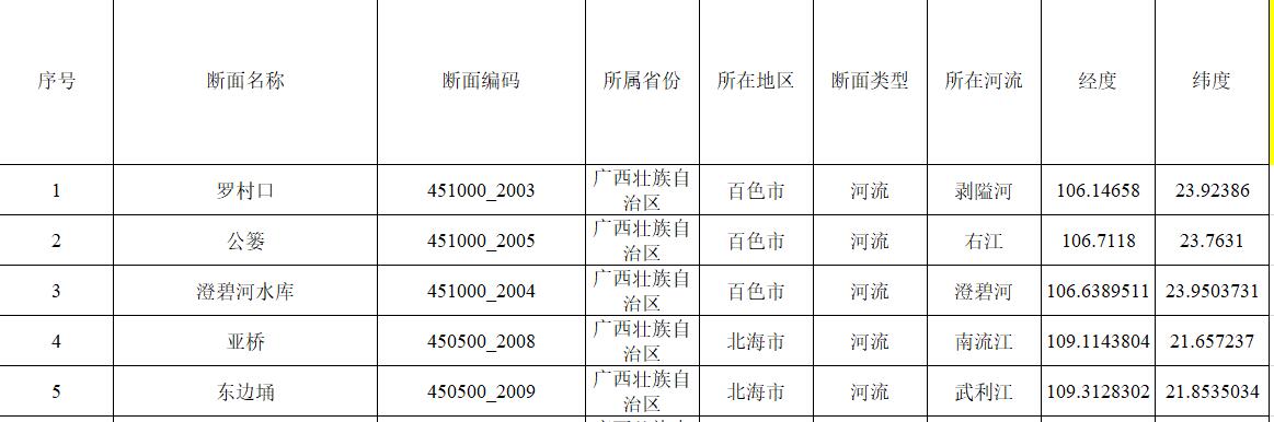 “十三五”广西壮族自治区地表水水质国控断面坐标数据,共50个断面,含断面名称、所在流域、所在水体、水体类型、经度、纬度、断面属性、所在省份、所在地市,可分流域和省市),配合早期(2016年1月——2020年12月)全国地表水水质月报或个人研究使用。