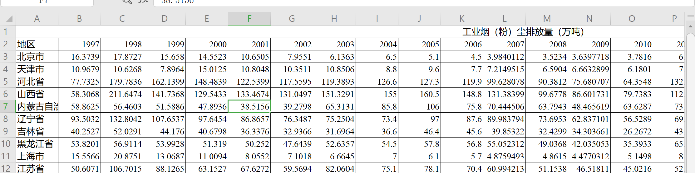 省级工业烟(粉)尘排放量(万吨)1997-2020省级工业烟(粉)尘排放量(万吨)1997-2020省级工业烟(粉)尘排放量(万吨)1997-2020省级工业烟(粉)尘排放量(万吨)1997-2020