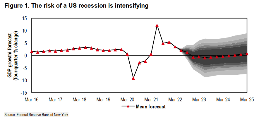 另一种纽约联储DSGE模型使用各种变量,包括美国实际工资、PCE、联邦基金、10年期美国国债收益率和GDP,表明美国“硬着陆”的可能性正在上升,未来10个季度GDP收缩1%(年化环比)的可能性约为80%,2023 年GDP平均预测为-0.5%。