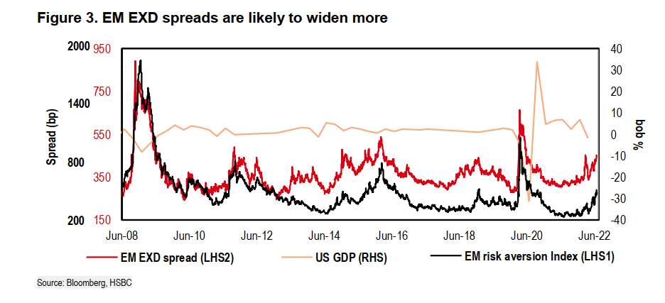在之前的报告【EM Action (Still hard choices, 27 June)】中,我们谈到,市场越来越关注美国可能出现的衰退及其对新兴市场固定收益的影响,鉴于信贷环境恶化,新兴市场外部货币 (EXD) 的表现仍可能继续逊于新兴市场本币。