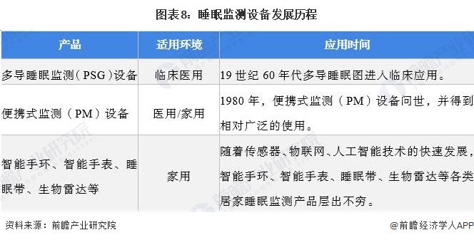 此外,近年来睡眠监测仪器的研发逐渐从医疗向健康产业转型,居家睡眠监测产品也层出不穷,推动了家用睡眠监测设备行业的发展。随着传感器、物联网、人工智能技术的快速发展,智能手环、智能手表、睡眠带、生物雷达等各类居家睡眠监测产品层出不穷。