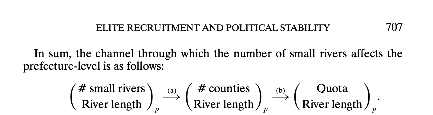 作者研究的是取消科举制对清末起义的影响。使用河流作为工作变量的原理在于,河流并不会影响起义;但是,河流却会影响行政区域划分,而行政区域越多,科举名额越多,在取消科举后,受到的影响也越大。
