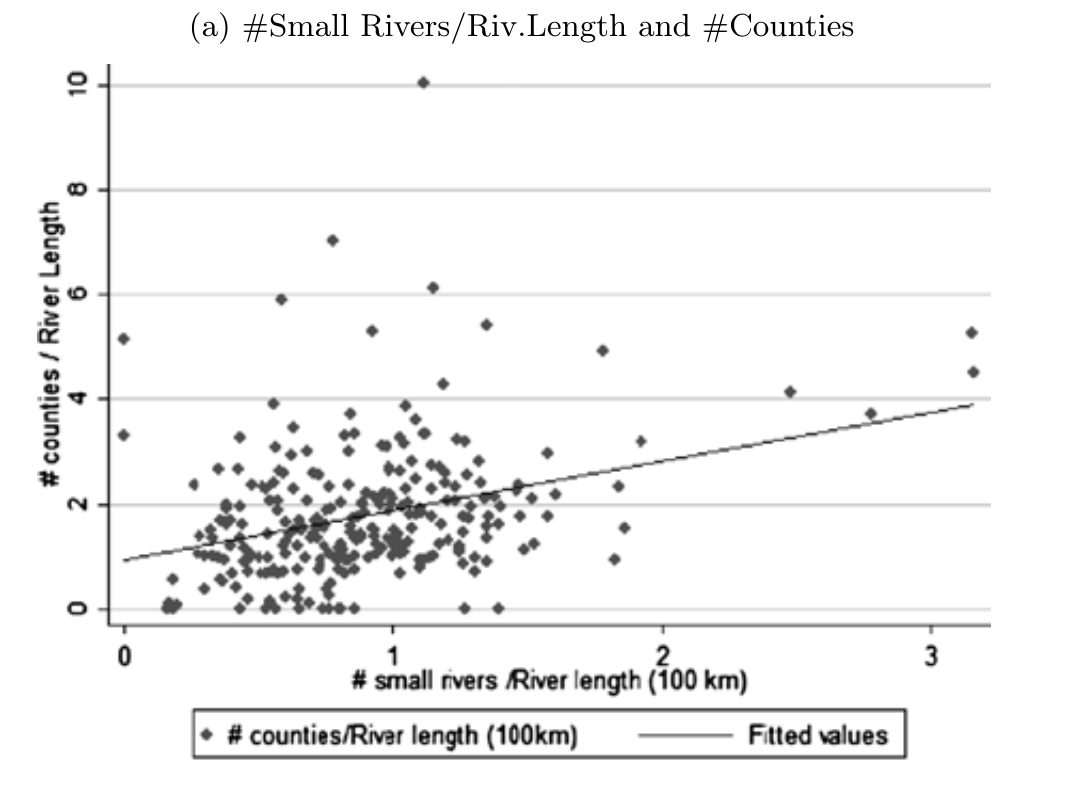 依循此理,我们可以发现,河流密度大有可为,可以作为经济增长目标,晋升激励等ZF行为的工具变量。因为河流密度会影响行政区划,而行政区划越密集,区域内ZF竞争越激烈。但是,河流密度,尤其是小河流的密度,其作为地理因素的一环,却往往具有很好的外生性。