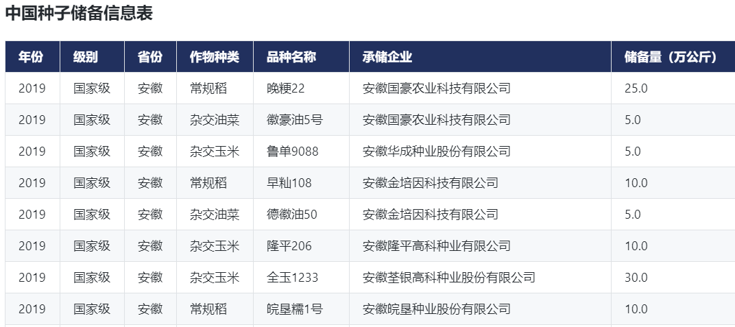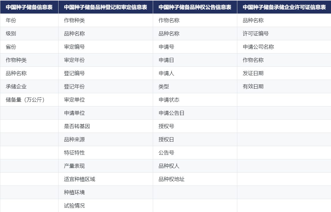 中国种子储备数据,按照中国种子储备信息表、中国种子储备品种登记和审定信息表、中国种子储备品种权公告信息表、中国种子储备承储企业许可证信息表四个分表列示,涵盖了作物名称、品种名称、申请号、申请日、申请人、申请状态、申请公告日、授权号等字段。